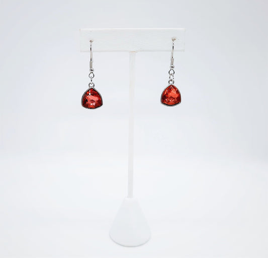Handmade / Handcrafted Multifaceted Red Rhinestone Triangle Pendant Earrings - Hypoallergenic Stainless Steel Ear Wire Hooks - Ruby / Garnet