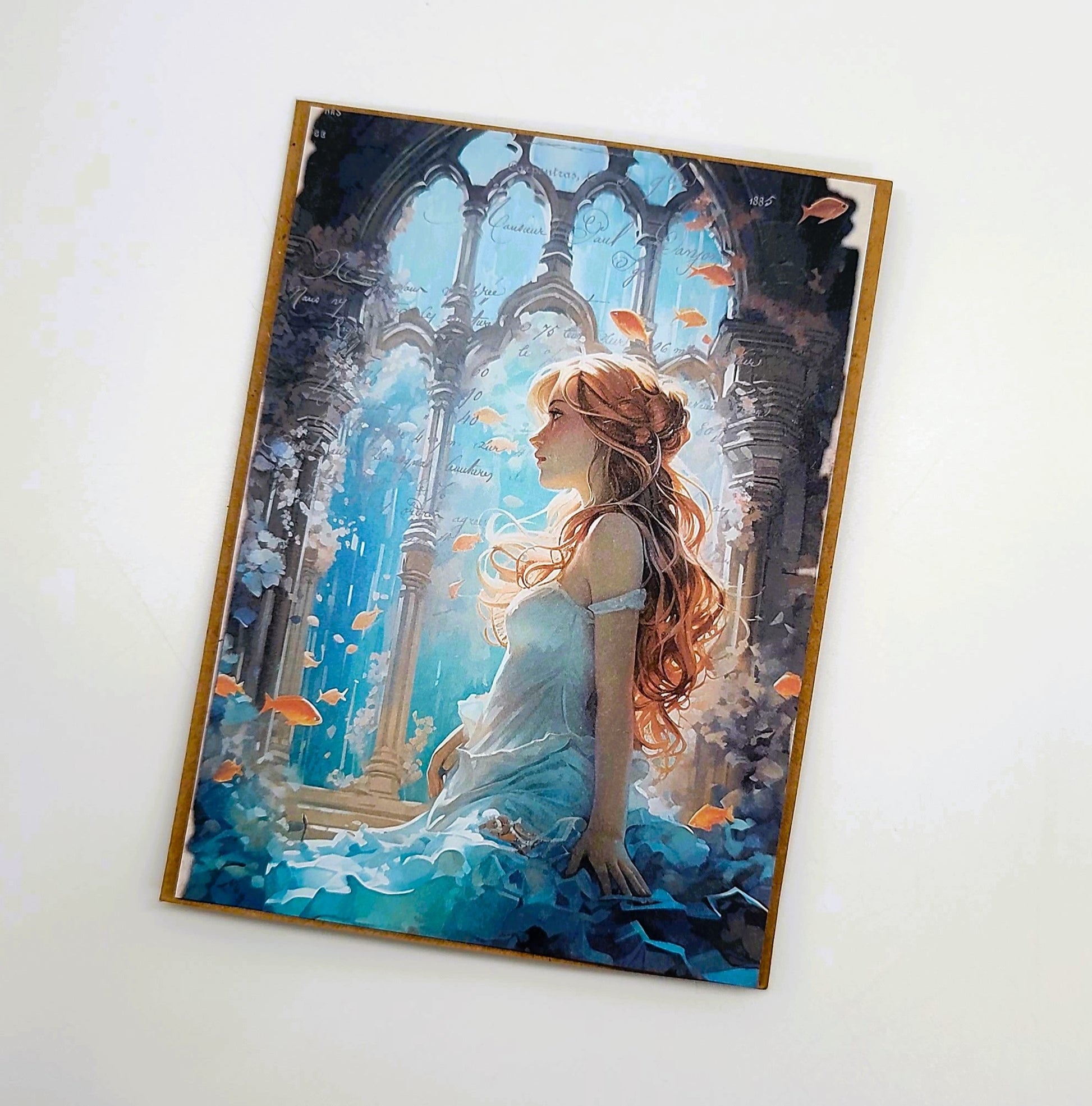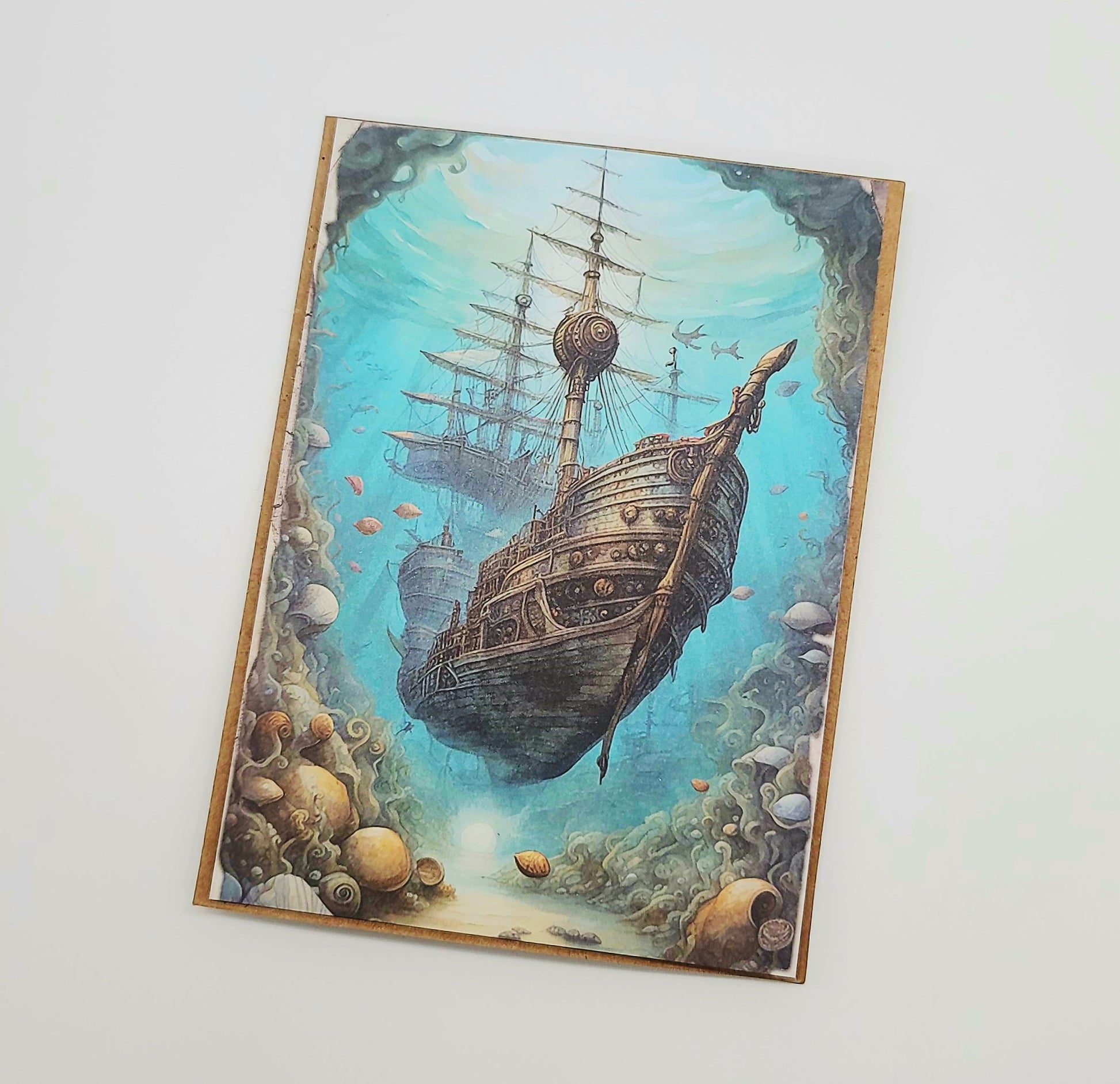 Mythology Fantasy Ocean Sea Mermaid Greeting Note Card w/ Envelope - Handcrafted, Decoupaged, Blank Inside, Made with Brown Kraft Paper Card Stock.
