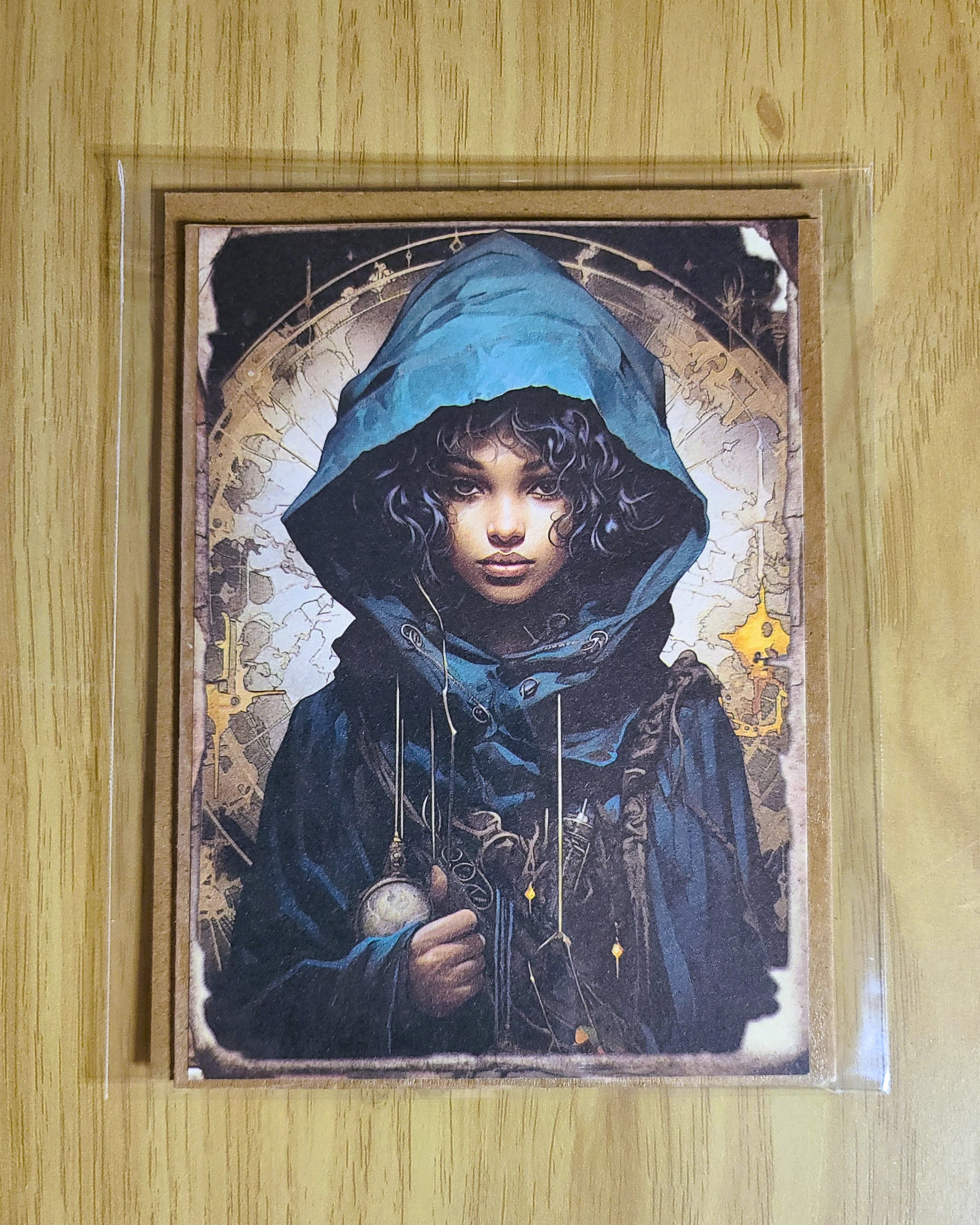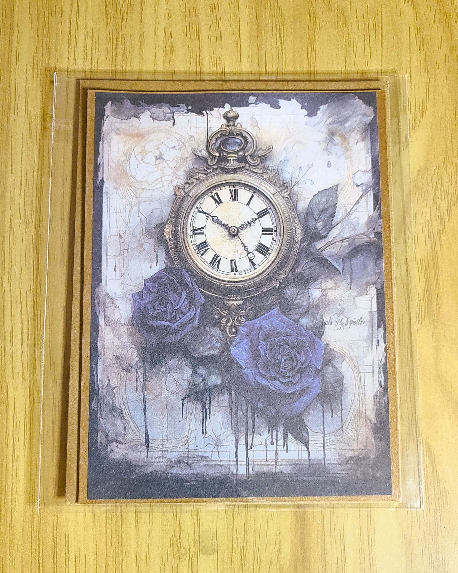 Each card is 4.375 x 5.75 inches, made with high quality brown Kraft paper card stock. The image is decoupaged onto the front of the card. The card is blank inside. Comes with self-sealing envelope, inside sealed cellophane bag.